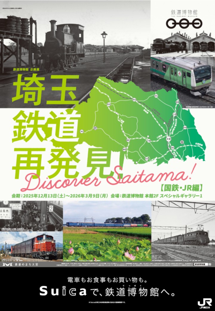企画展「埼玉 鉄道再発見!~Disover Saitama~」 会期:令和7年12月13日(土)~令和8年6月15日(月) 前期:【国鉄・JR編】 令和7年年12月13日(土)~令和8年3月9日(月) 後期:【私鉄・三セク編】 令和8年3月14日(土)~6月15日(月) |