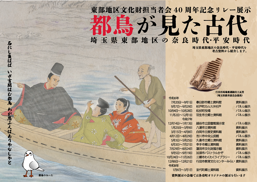 特別展「笠原沼の造成と新田開発」 会期:令和7年10月25日(土)~12月21日(日) 東部地区文化財担当者会40周年記念リレー展示 企画展 「都鳥が見た古代~埼玉県東部地区の奈良時代・平安時代~」 会期:令和8年1月6日(火)~3月1日(日) |